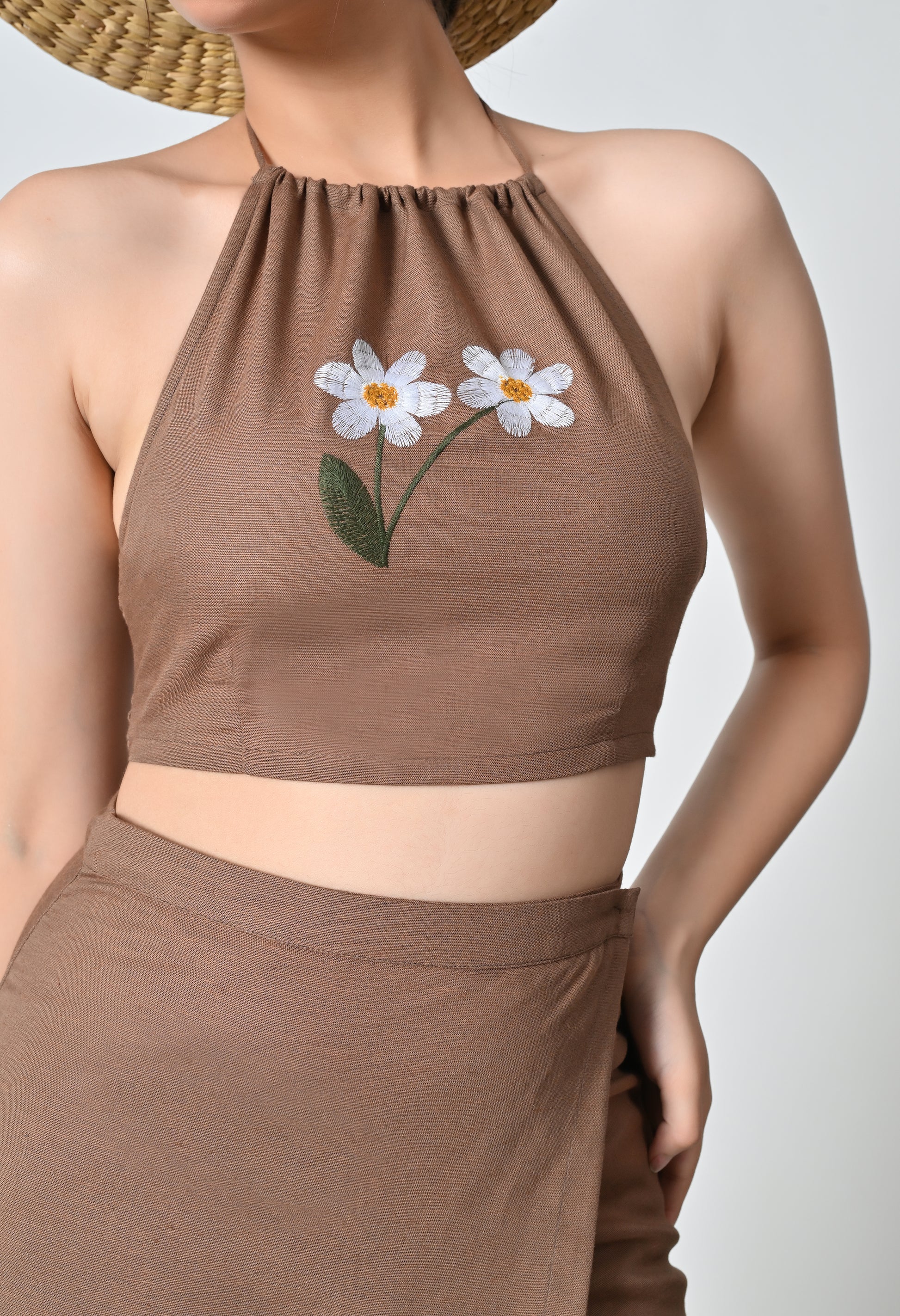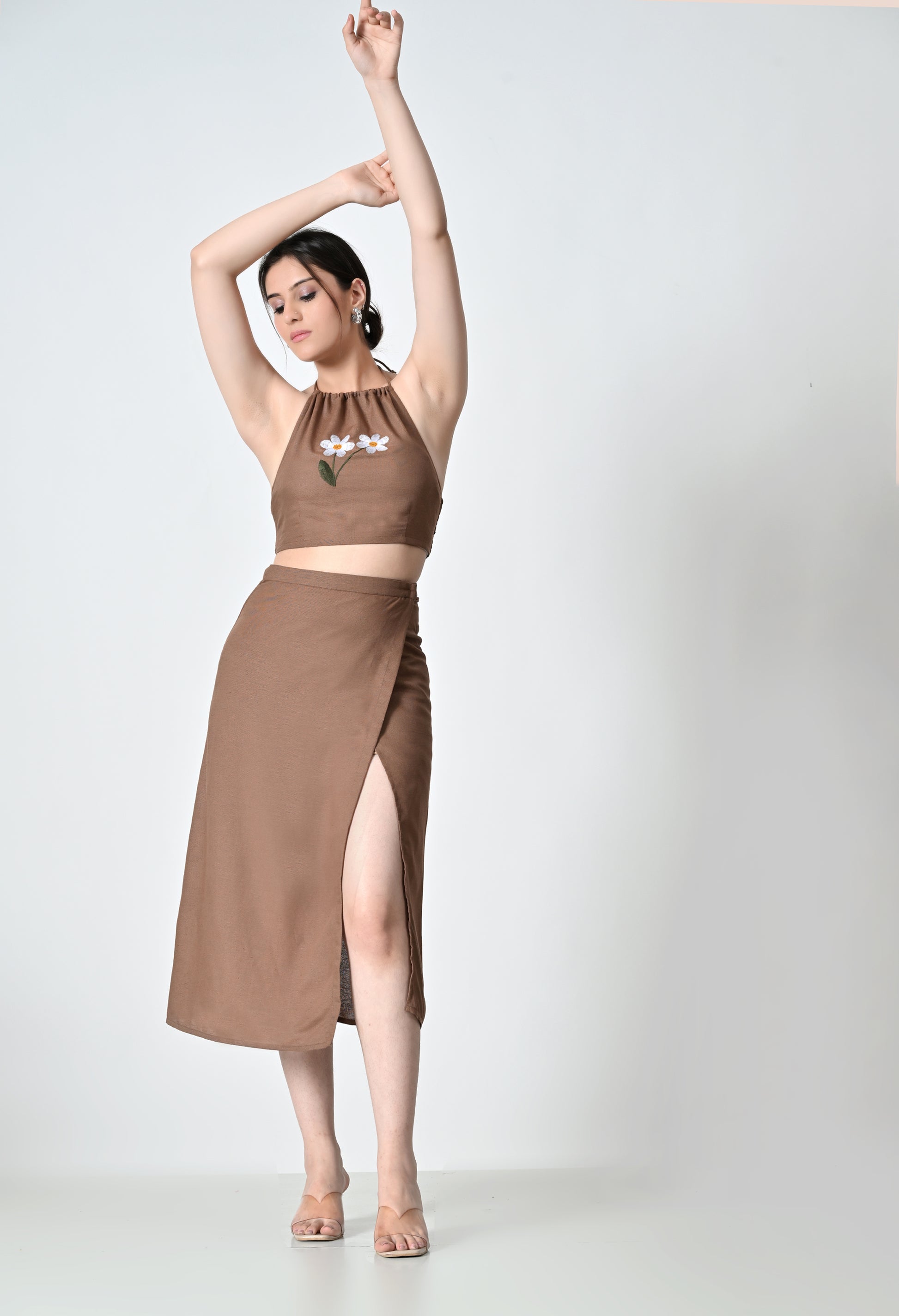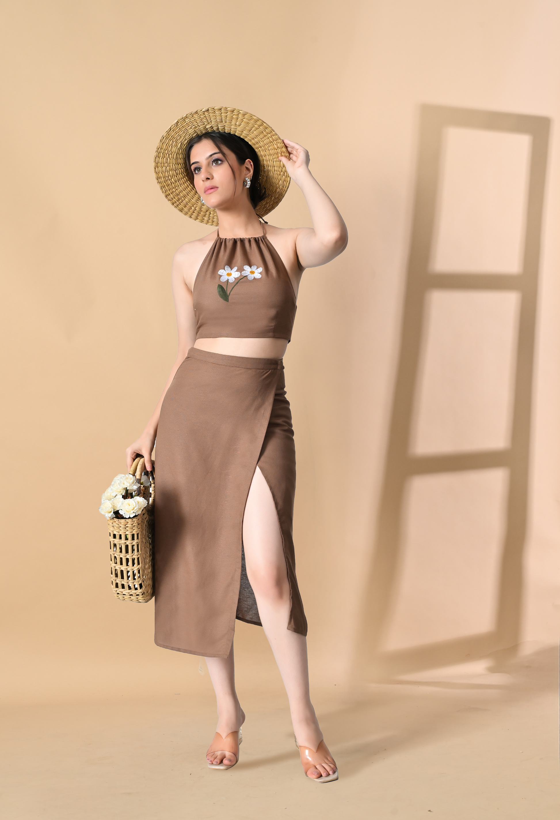 Brown Linen Co-ord Set with Floral Embroidered Top