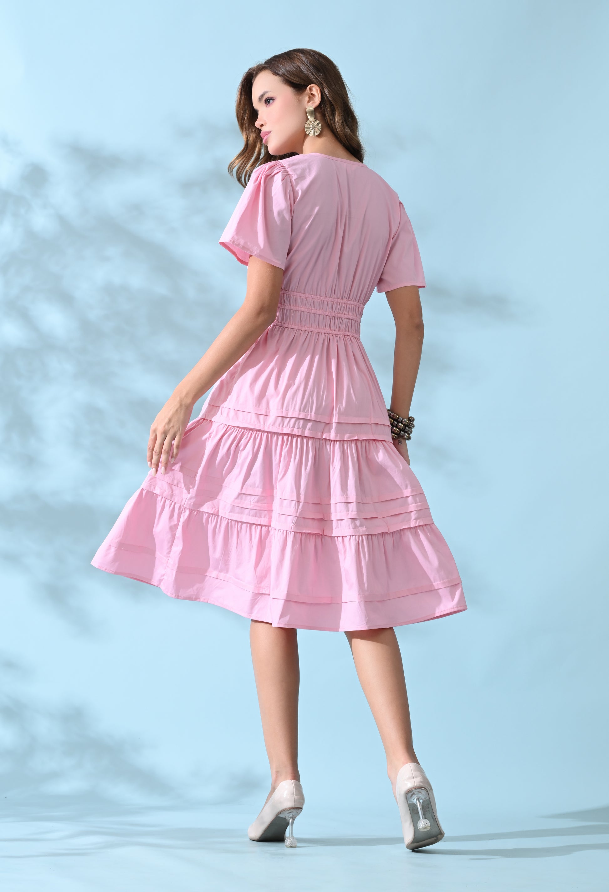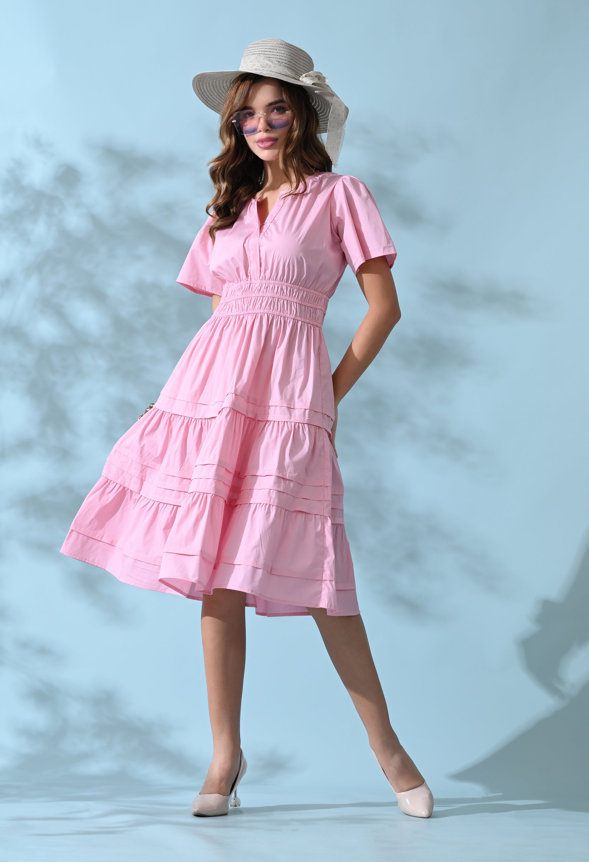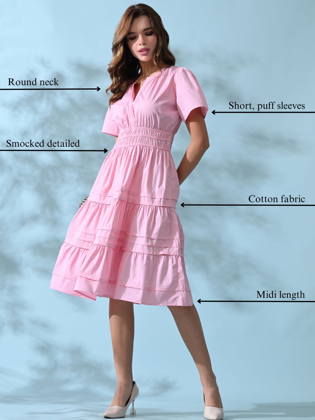 Puff Sleeves Smocked Detailed Tiered Cotton Fit & Flare Midi Dress